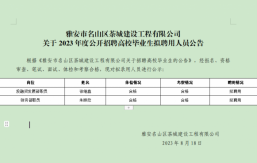 雅安市名山區(qū)茶城建設(shè)工程有限公司系雅安市名山區(qū)區(qū)屬一級國有企業(yè),成立于2018年10月,注冊資本金25000萬元,主要經(jīng)營范圍為對土地、城市資源等領(lǐng)域及保障性住房、房地產(chǎn)開發(fā)、城市基礎(chǔ)設(shè)施、公共服務(wù)設(shè)施等進行經(jīng)營管理;并開展項目投資、工程管理服務(wù)、園林綠化、環(huán)境治理工程、土地整理和各類工程建設(shè)活動等。根據(jù)公司2023年人員招聘計劃,茶城公司擬面向社會公開招聘3名工作人員?,F(xiàn)將有關(guān)事項公告如下:一、報名條件(一)招錄崗位、名額及招錄資格條件(見附表)(二)基本條件1.本科及以上學(xué)歷、學(xué)士及以上學(xué)位。包括2023年應(yīng)屆高校畢業(yè)生;2022年、2021年未參加工...